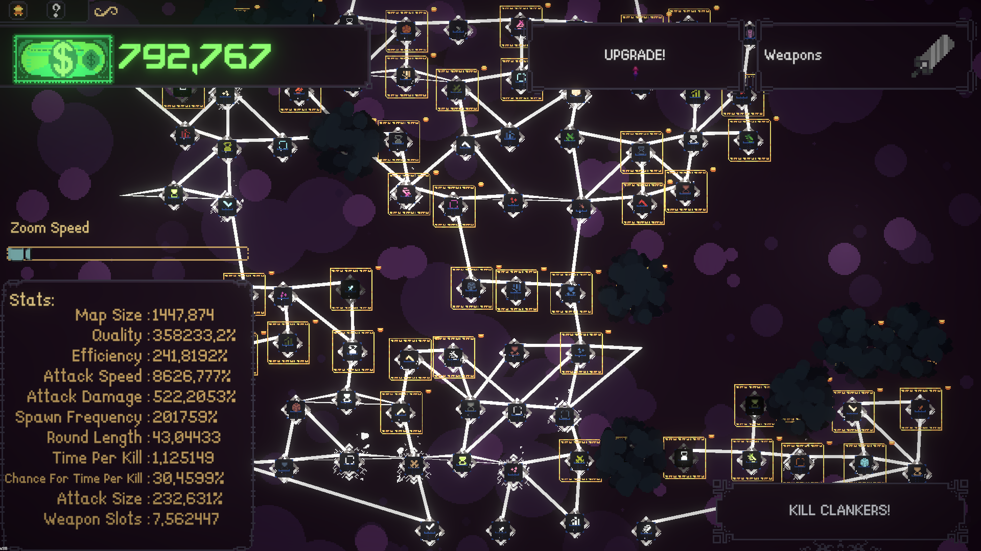 The game part is very frustrating as you start. Super short time, you miss often, focusing to let your cursor on an enemy is tiring... It should have got the effects instead of the upgrade screen to make the game more juicy and satisfying!